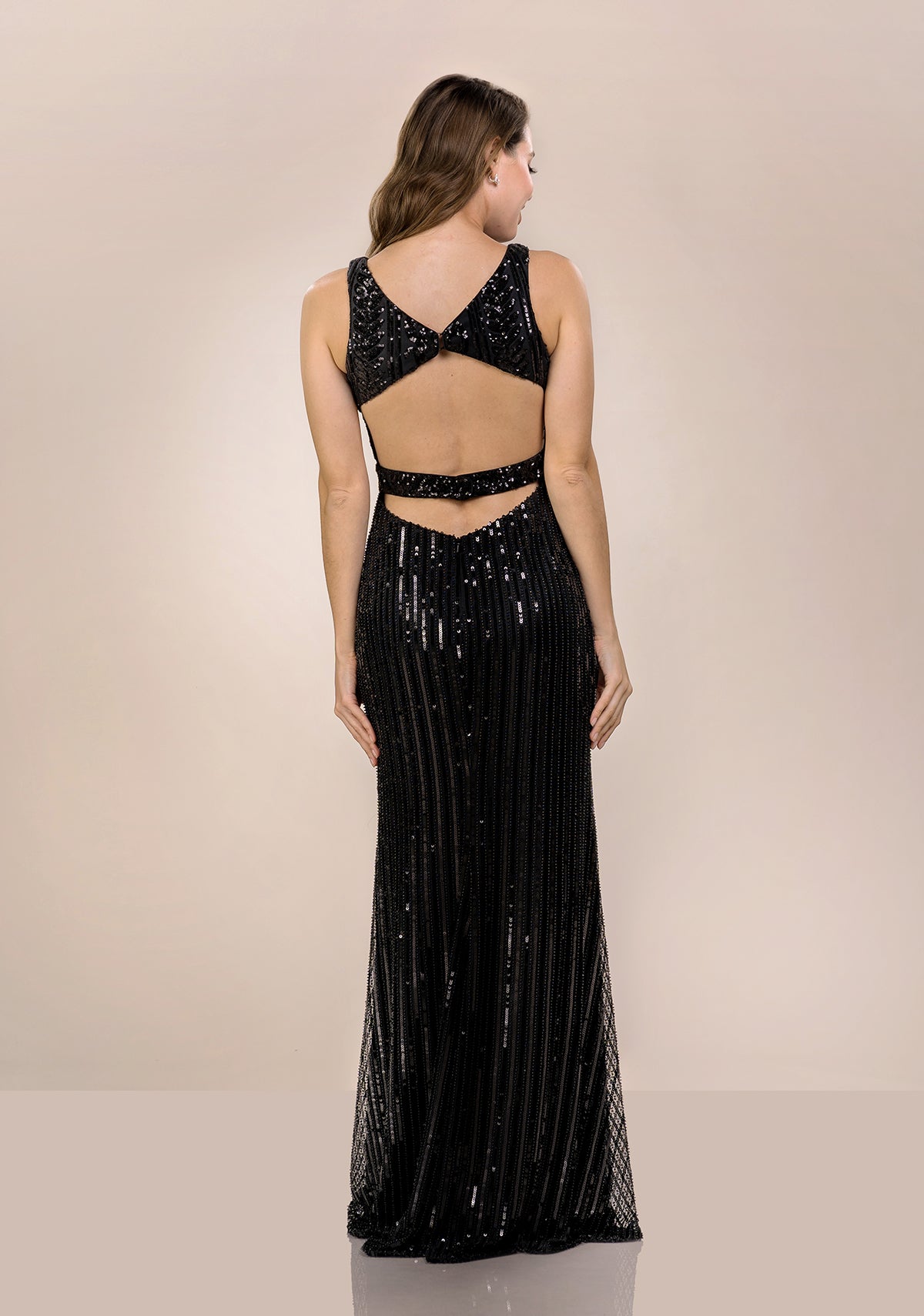 Embellished beaded design by Christian Koehlert. Beautiful for a black tie event or special occasion. Deep plunging V neckline and eye catching unique styled back!