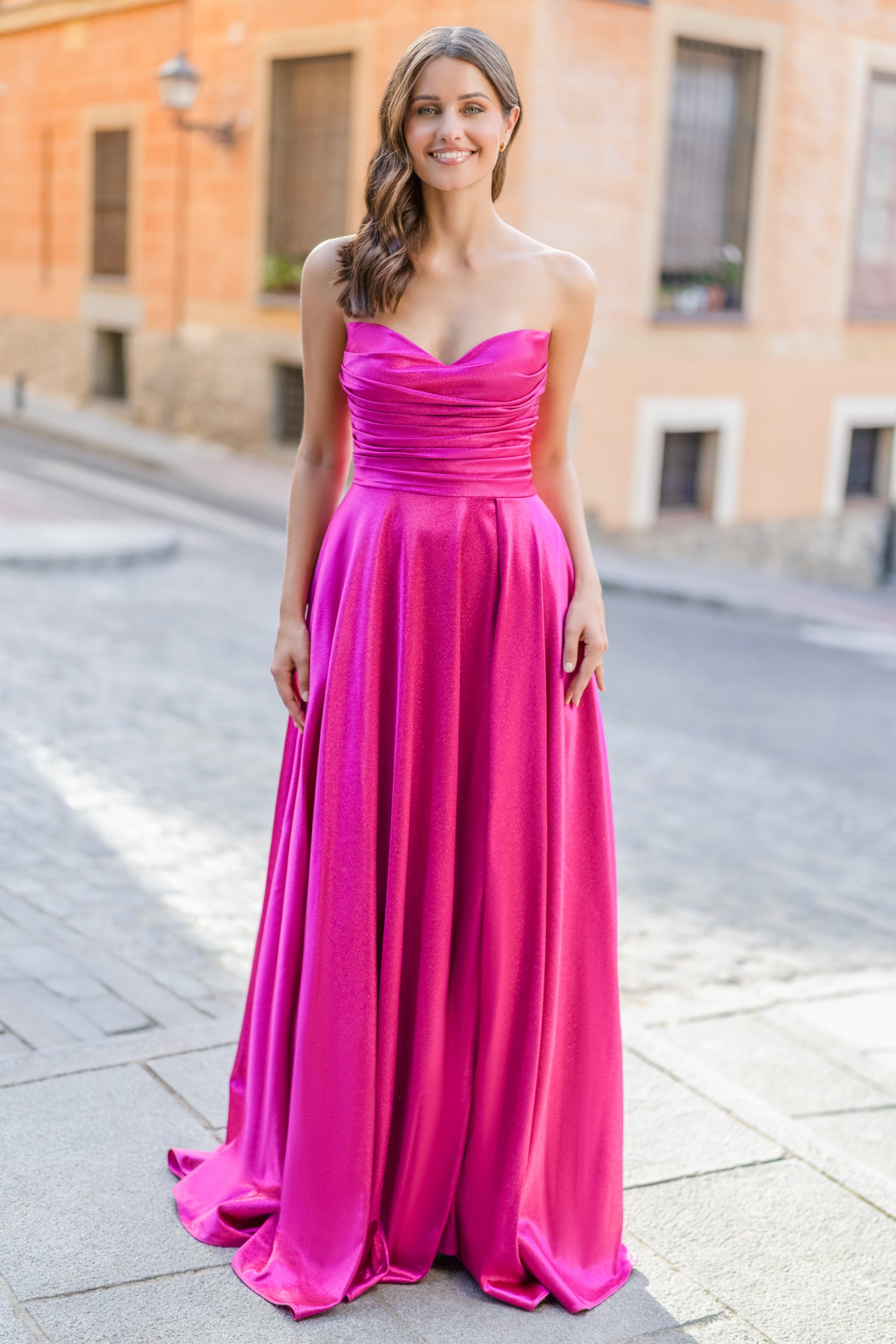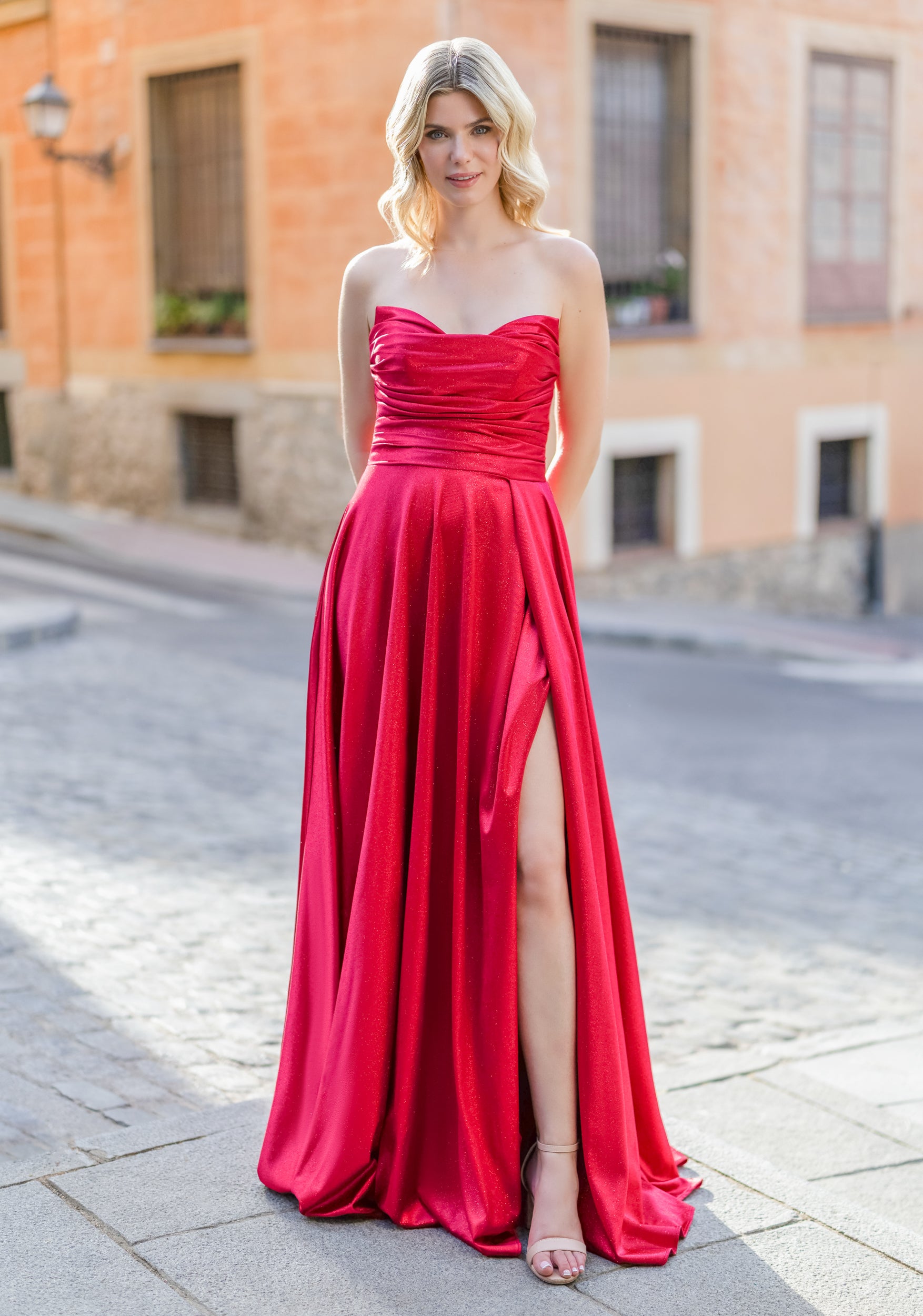 This stunning gown from Christian Koehlert, features a shimmering fabric that catches the light beautifully. Designed with delicate spaghetti straps and a flattering ruched bodice, it flows into a fuller A-line skirt with an elegant high slit for added movement. Perfect dress for prom, formal events or any occasion where you want to make a statement.