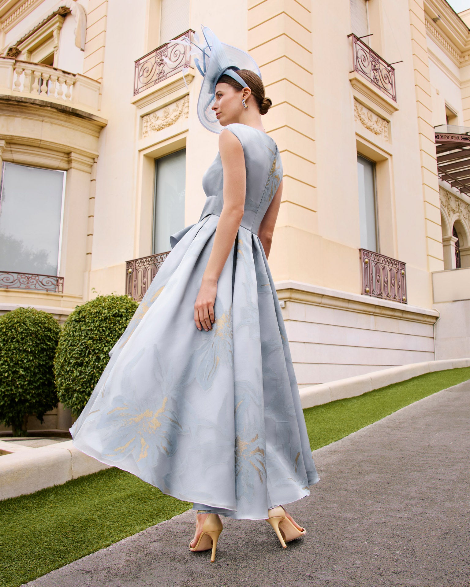 Dramatic dipped hem dress featuring a round neckline and bow detailing on the waist.