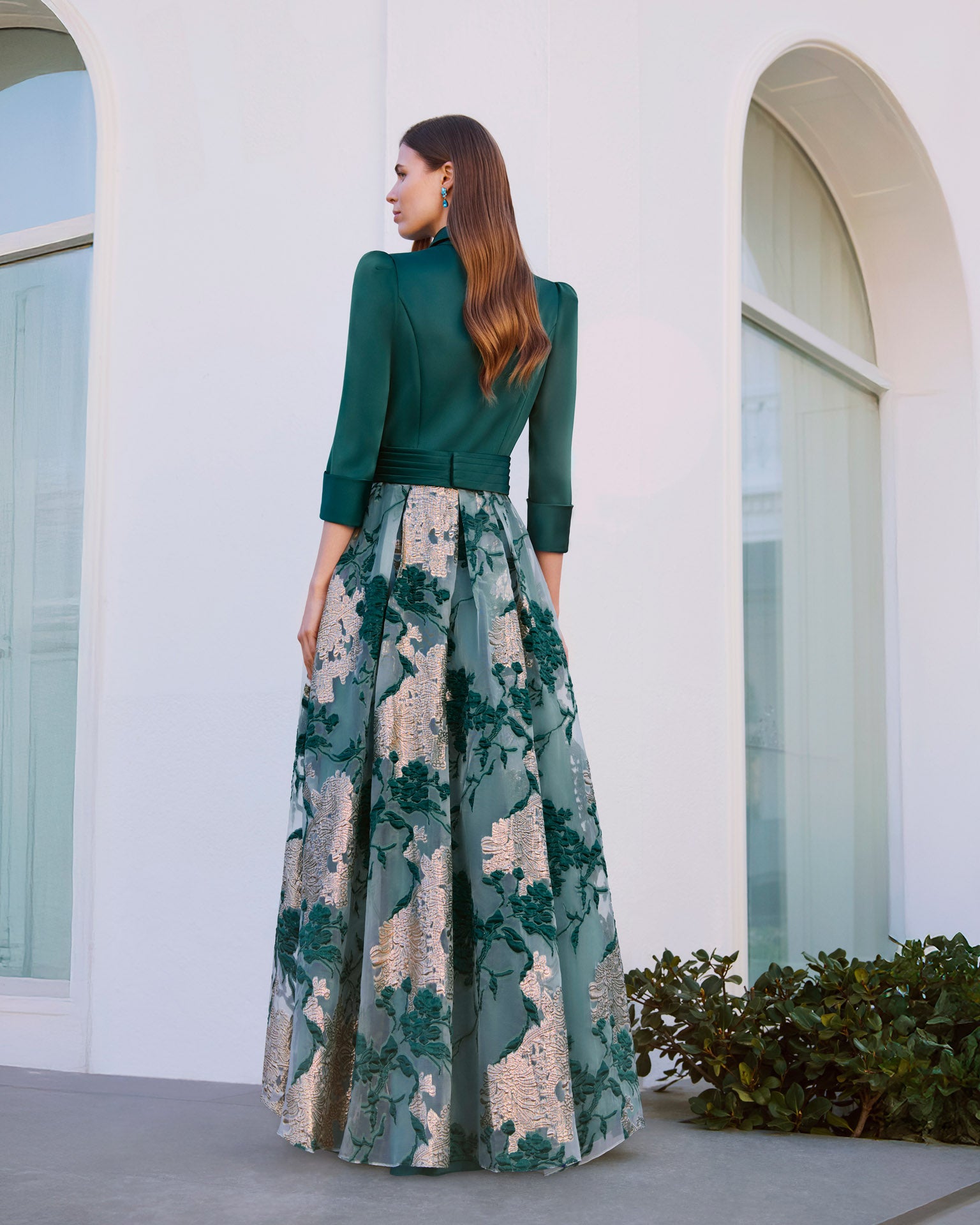 Long length evening dree with fil coupé skirt and satin bodice. Featuring shirt collar, long sleeves and a closed back.