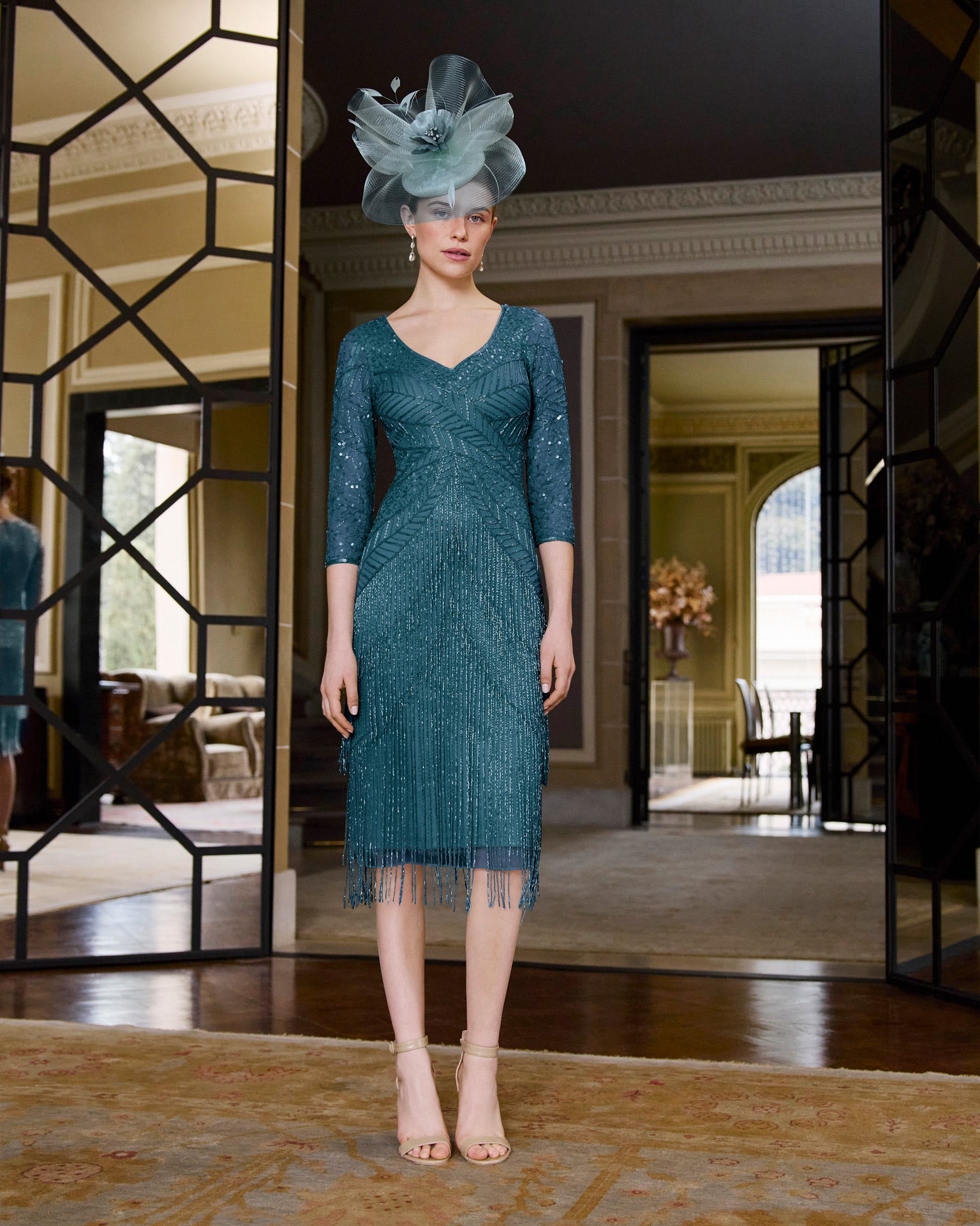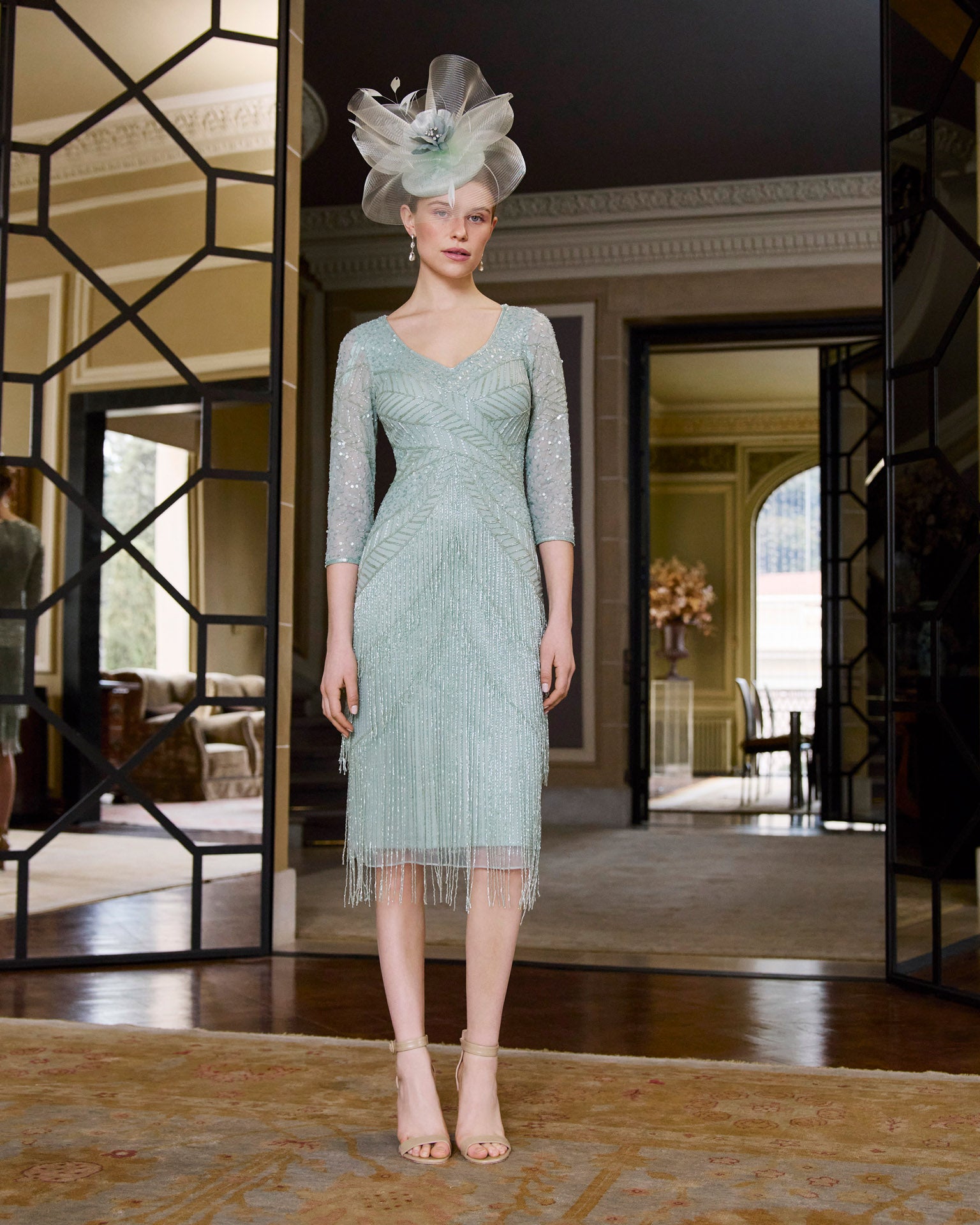 Knee-length evening dress, fully beaded, patterned design, complete with a V-neck and three-quarter sleeves.