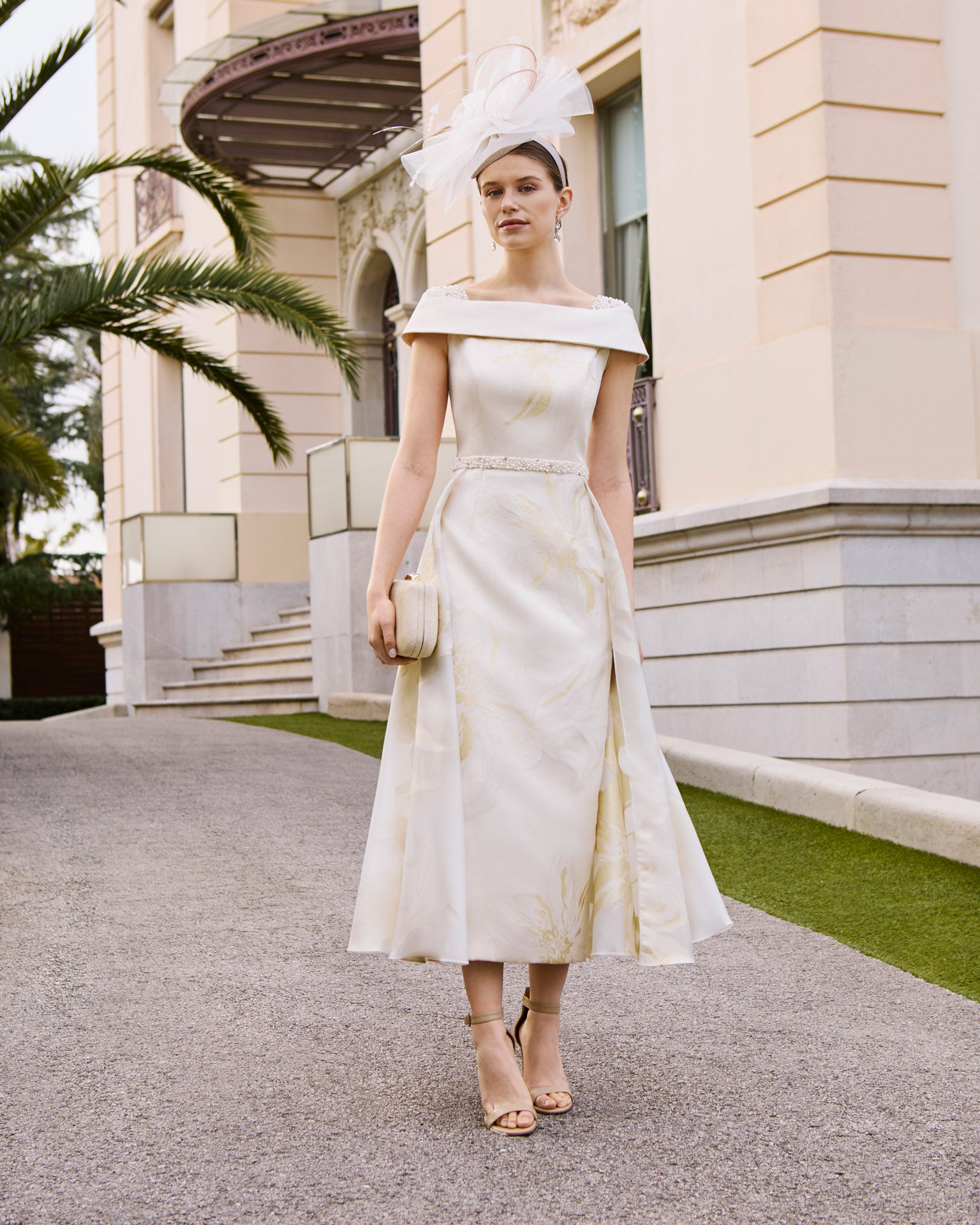 Midi occasionwear dress made of fil coupé with beautiful beading and gorgeous bardot neckline.