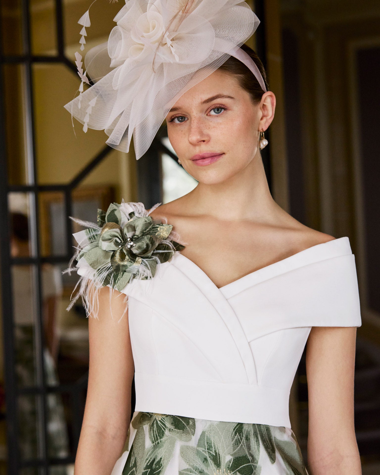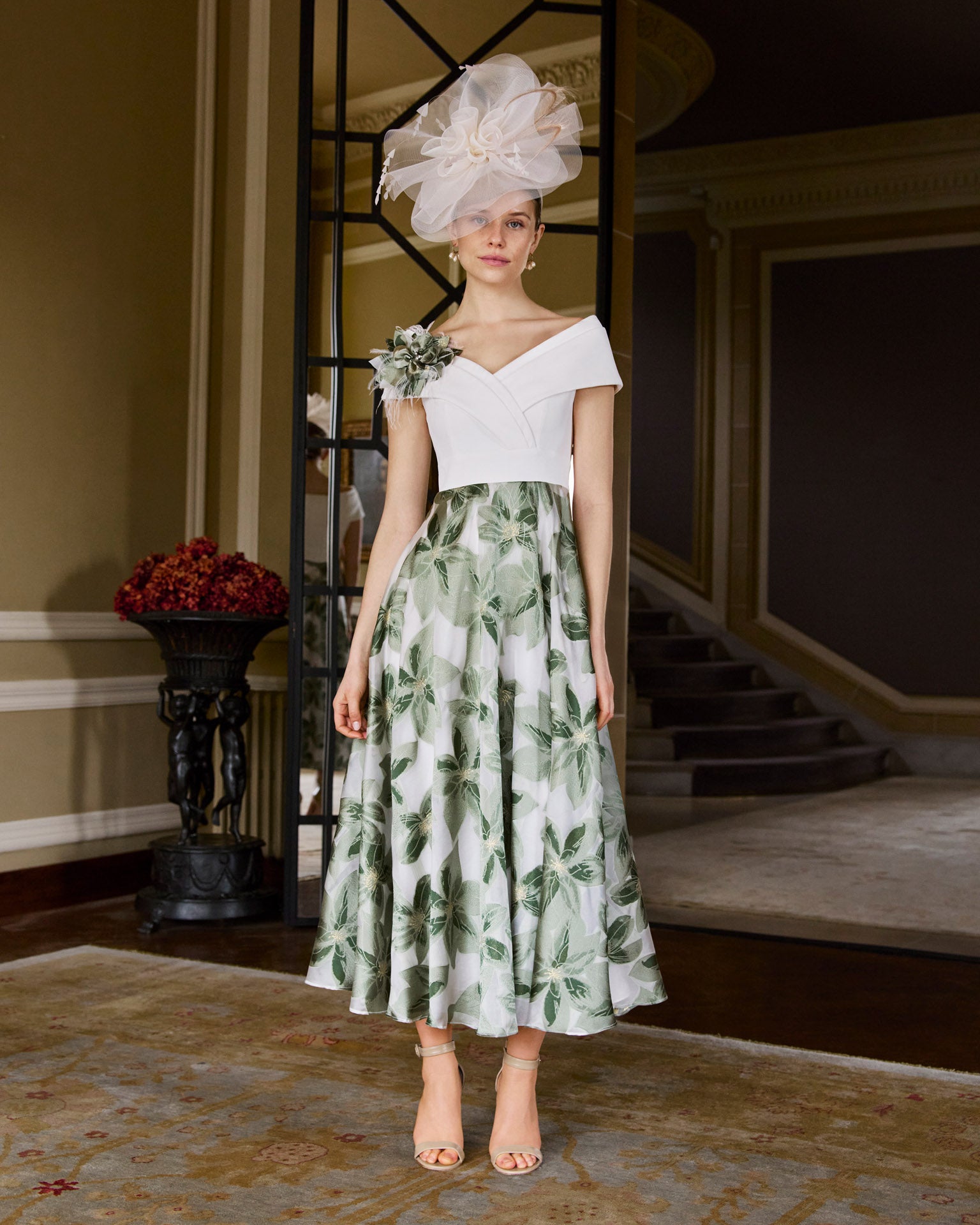 Midi evening dress with fil coupé skirt and crepe bodice. Featuring wrap neckline and flower.