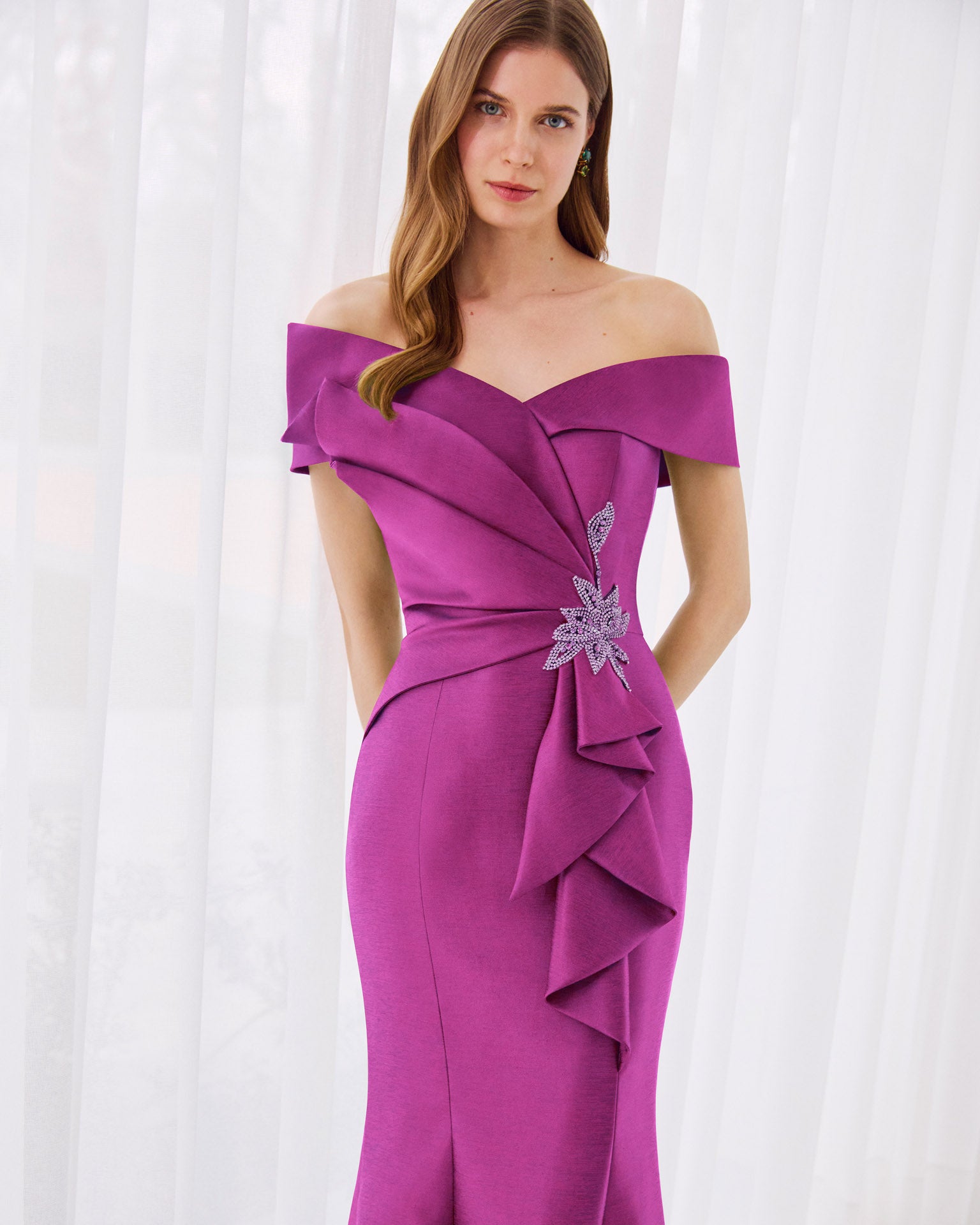 Long evening dress made of mikado with wrap neckline featuring sash and beading on waistline.