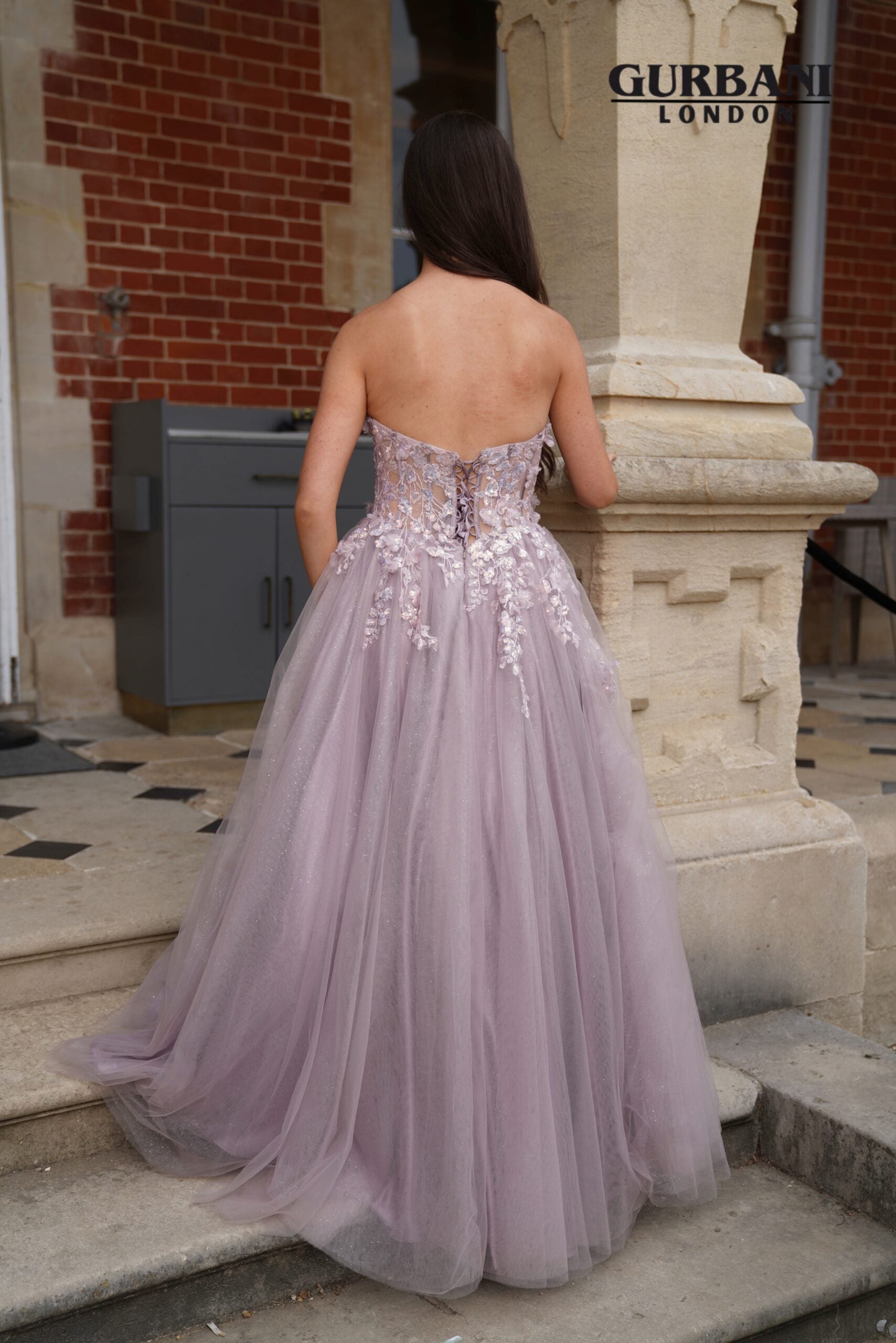 This beautiful lilac strapless gown by Gurbani London will take you to a fairy tale. The structured sweetheart neckline looks great on the décolletage and is made of layers of soft tulle.