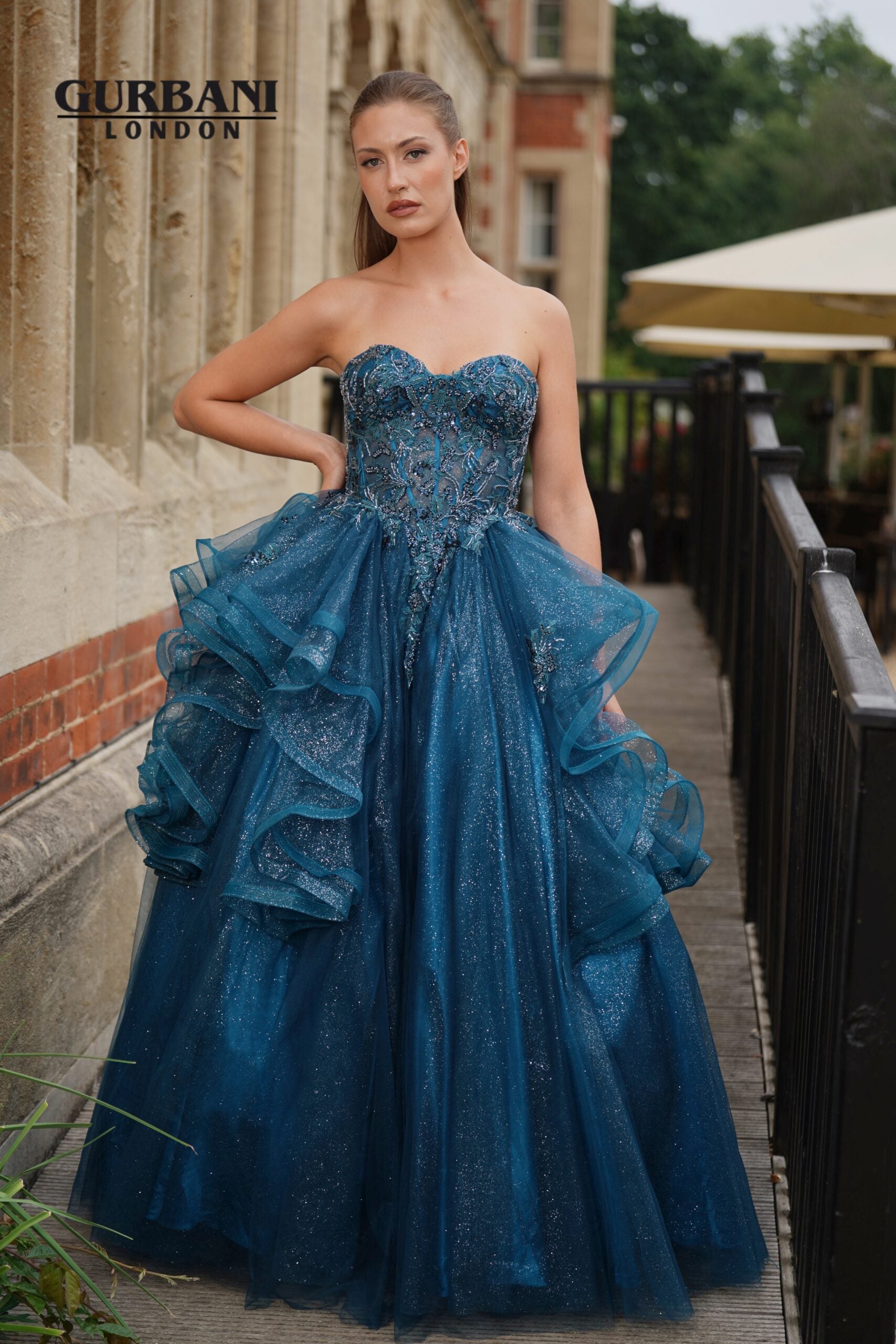 This stunning gurbani gown just screams prom! This strapless style dress features a structured, embellished bodice ideal for anyone who wants to make a statement. The corset-style top is complemented by the A-line style skort adorned with tiered layers of glittery tulle.