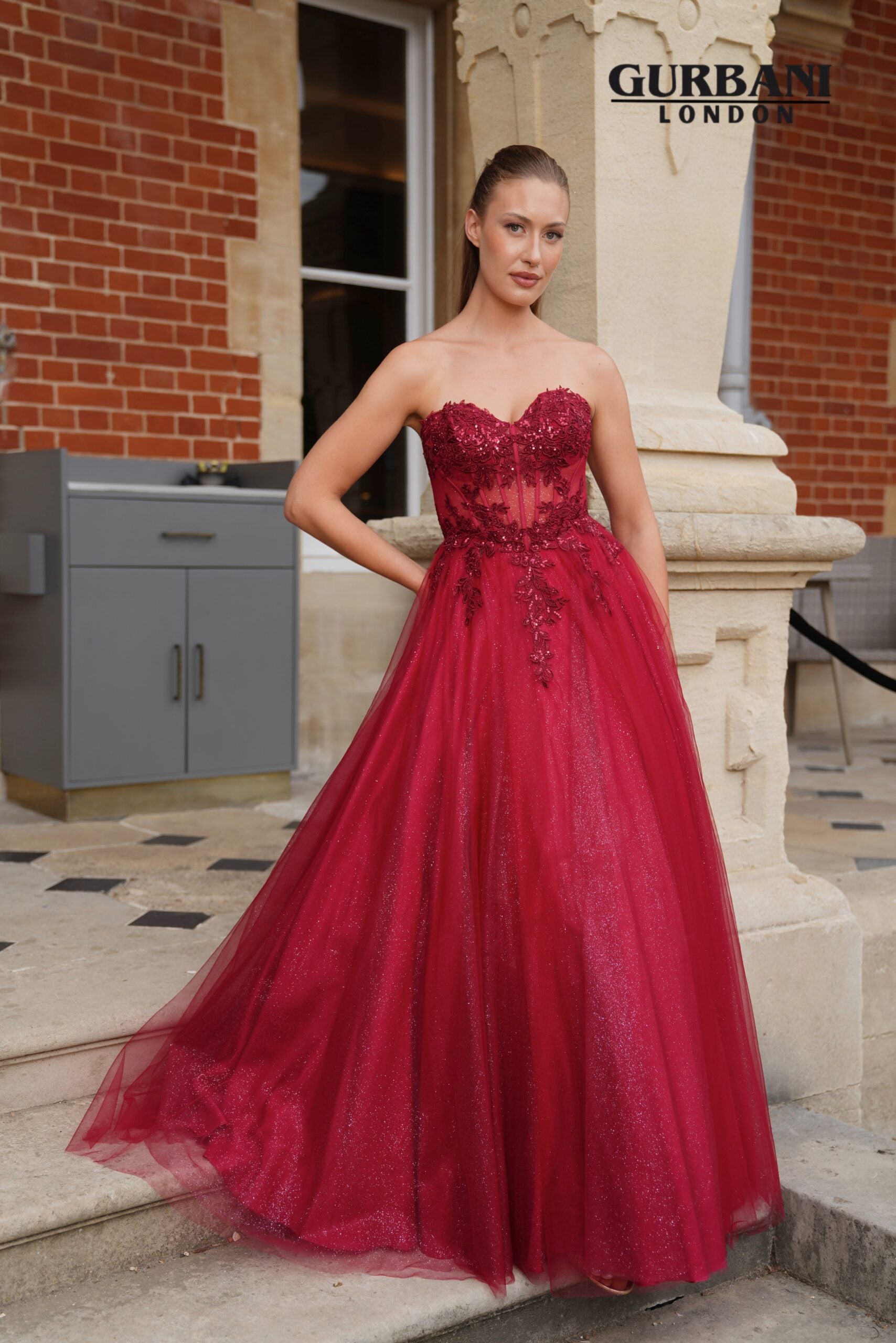 This enchanting corset gown by Gurbani London is designed to captivate, a mesmerizing fusion of romantic whimsy and refined luxury that ensures all eyes are on you.