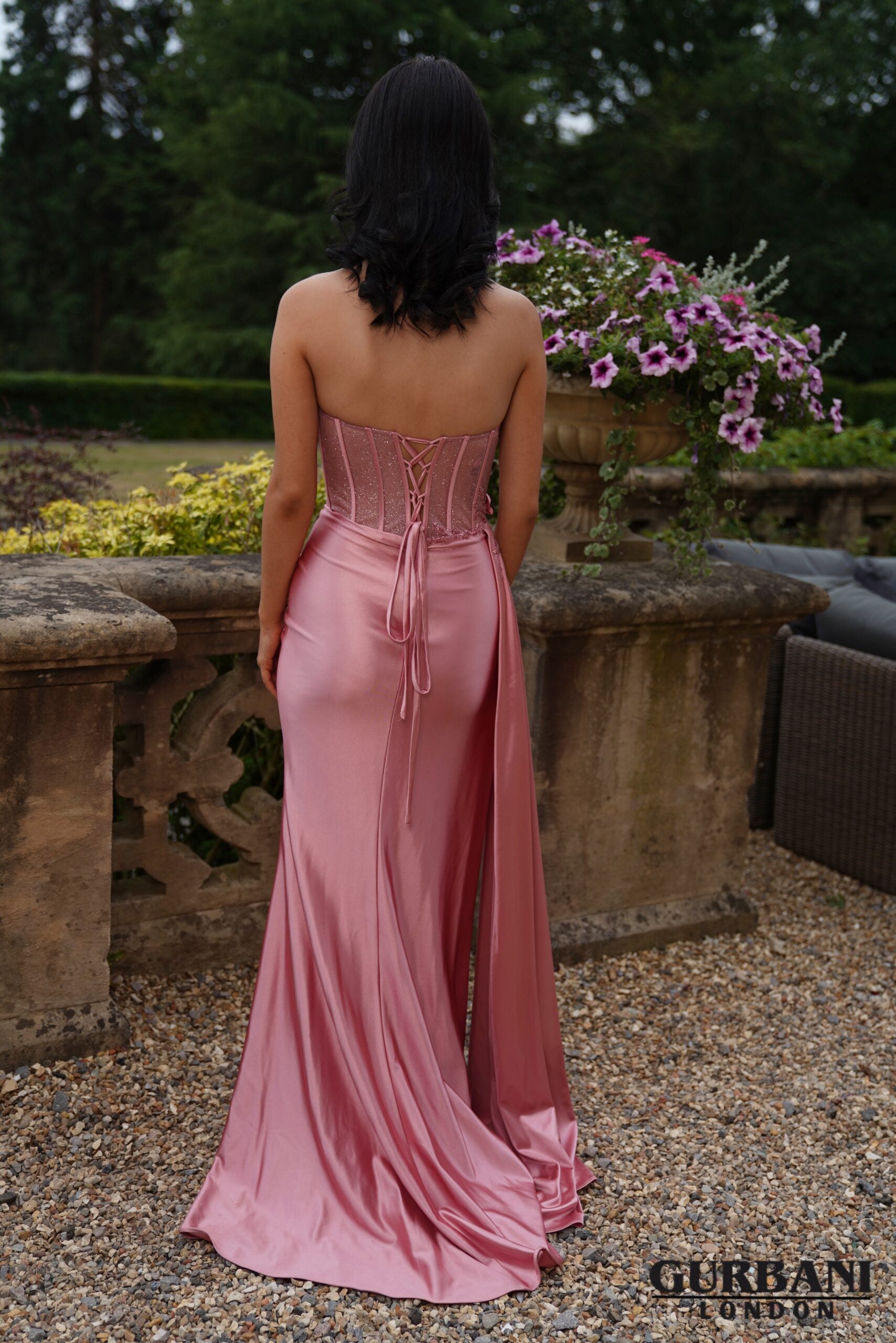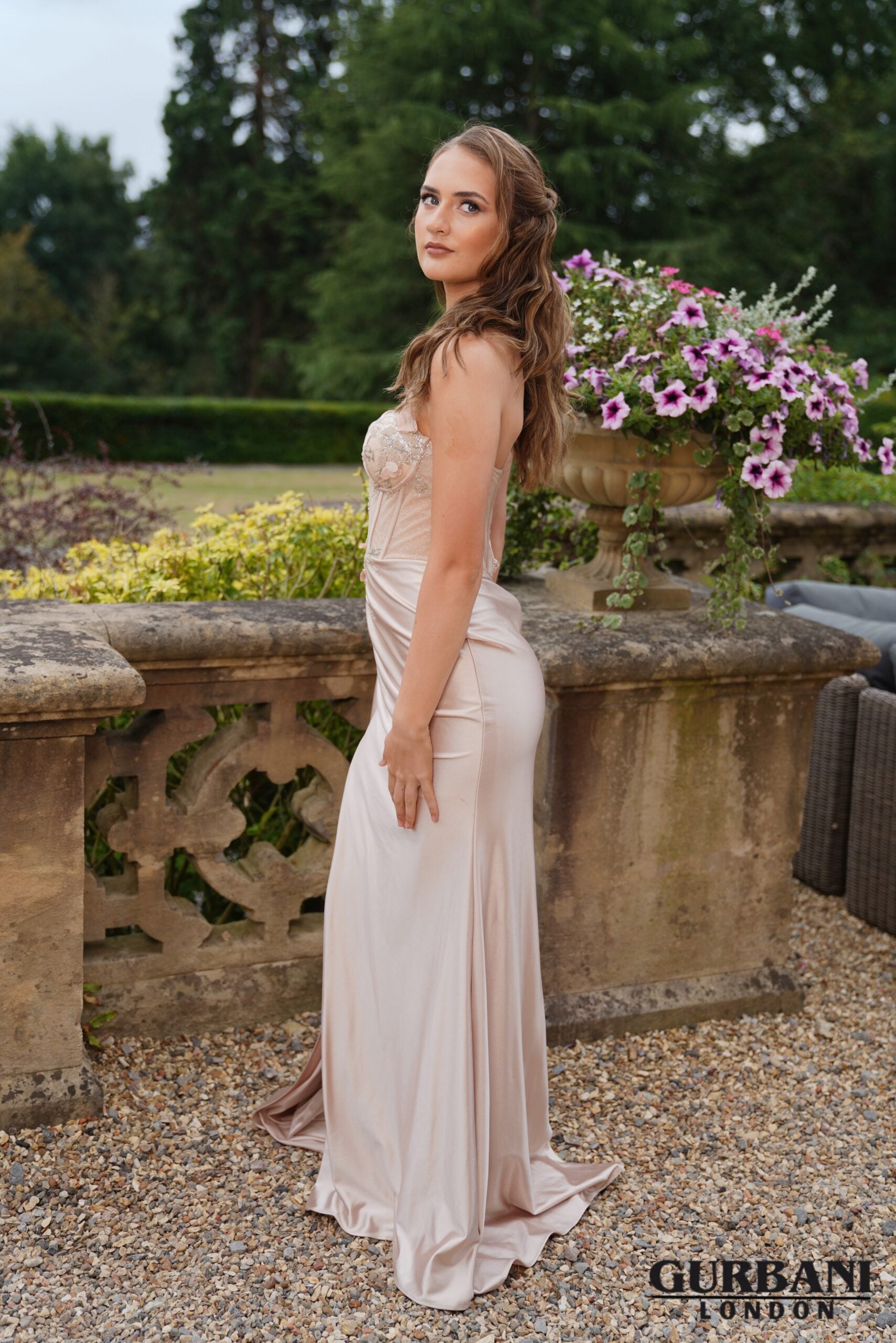 This dress, which was designed to accentuate natural curves, has a structured lace corset bodice with delicate floral embroidery that gives the silhouette a soft, feminine charm. Before softly descending into a flowing, floor-length hem, the fitted style hugs the body through the hips and waist. The champagne satin fabric’s delicate sheen produces an effortlessly radiant finish as it glows in the light.