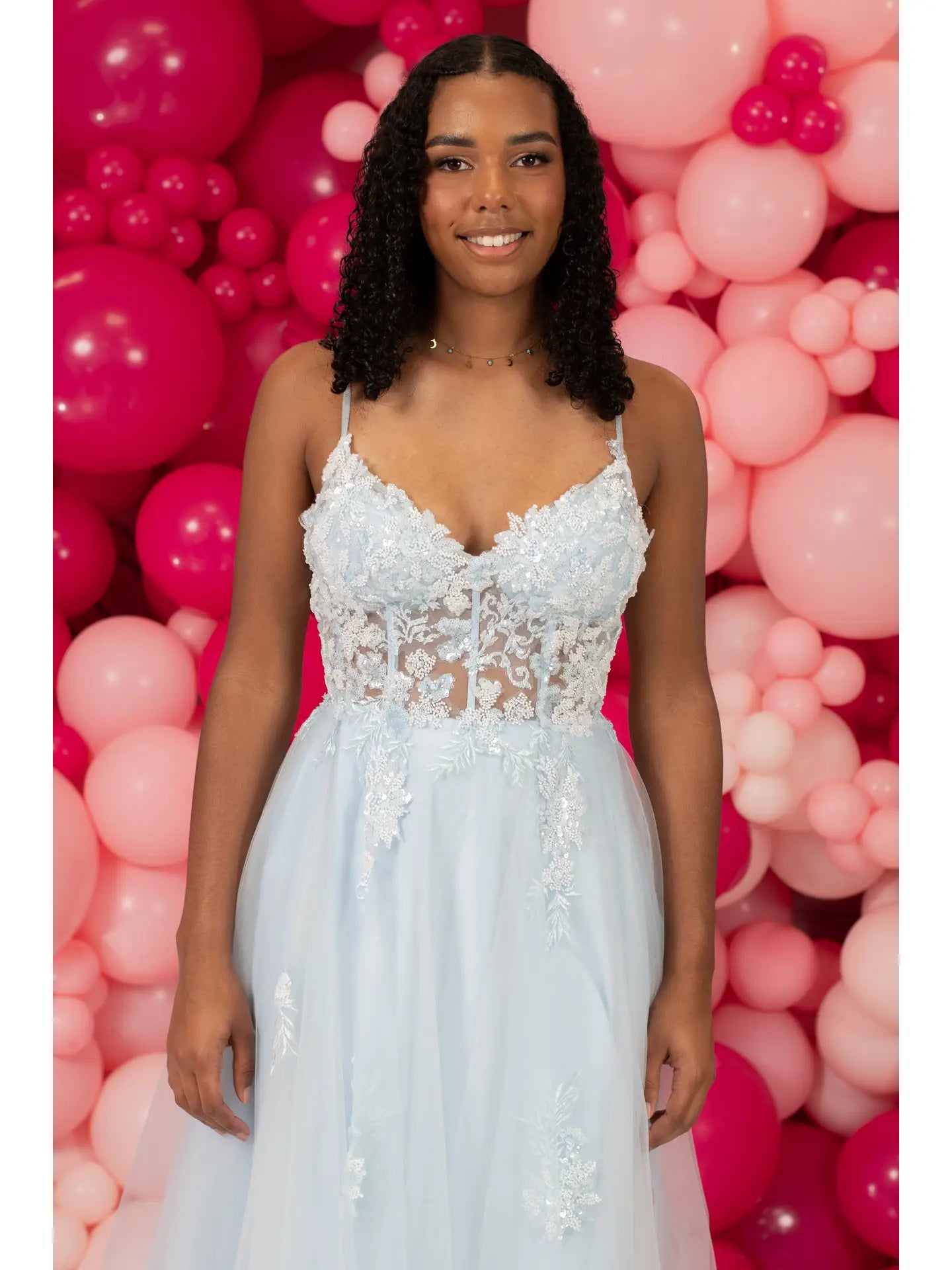 Soft A line tulle dress, with split in skirt and small puddle train. Bodice is semi sheer boned with sequin lace detail in light blue tones. V neckline and spaghetti straps. Back has open cut out detailing with criss-cross tie detail. Low open back, skirt has zip fastening with hook and eye.